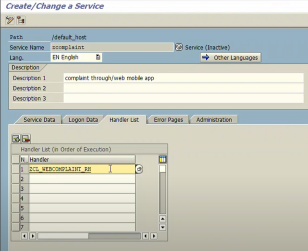 SICF 서비스를 생성하고 생성된 handler 클래스에 추가한다.